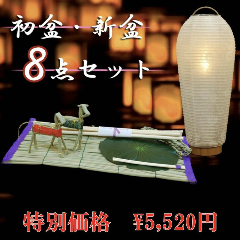 ○小珠提灯・電池式ローソク・盆ござ・まこも縄・ハスの葉・精霊箸・おがら・牛馬が一つになったセットです。