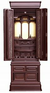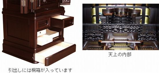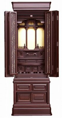 重厚感のある黒檀のフロア・床置モデルの伝統型仏壇です。透かし格子の欄間や組子障子の内扉など伝統型のお仏壇の中では、スッキリとしたデザインのお仏壇です。戸枠の二方練り、戸板の無垢材、扉や引き出し・引き戸などの角を丸く仕上る角丸加工、お仏壇の最下部の台輪の部分に大引出しを付け、全ての引き出しに桐落しと呼ばれる桐の箱を入れました。伝統型仏壇の積重ねてきた職人の技を継承しています。 ○扉は二枚扉で、おリンや香炉などを載せる便利な、スライド式の棚(膳引き)付です。 ○伝統型仏壇には、ご希望により家紋をサービスでお付けします。 ○伝統型仏壇には、照明が付いておりませんので、別途LEDライト付きの吊灯篭をご利用下さい。 ※各種吊灯篭を特別価格にてご奉仕中です。 ●配送は、スタッフ2人でお伺いいたしまして、設置・ダンボールの回収など行ないます。 ※写真と実際の商品では多少色合いなど異なる場合がございます。
