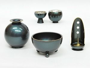 とても繊細で美しい仏具です。富山県高岡市の永い伝統の金属伝統工芸の職人さんが伝統の技術を結集して、風格ある渋い色合い、優雅さと優美の仏具に仕上げました。モダンな仏壇が更に格調高くなります。 ○五具足:香炉(線香立て)・花立・火立・仏飯器(ごはん)・茶湯器(お茶など) ※香炉灰付き ◇素材:真鍮