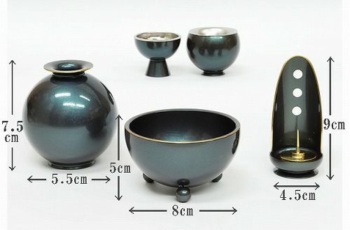 ◇各サイズ 香炉(お線香立て):高さ5cm径8cm 火立(ローソク立て):高さ4cm径5.5cm 花立:7.5cm径5.5cm ※写真と実際の商品では多少色合いなど異なる場合がございます。