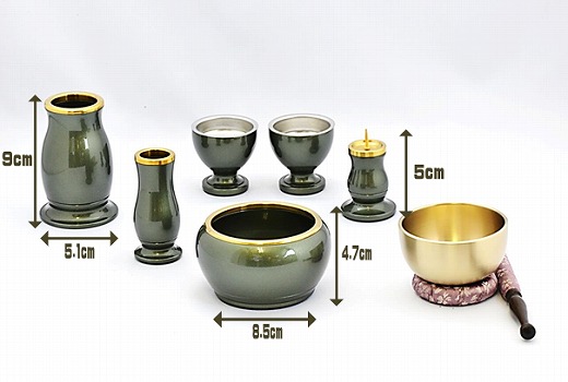 ○おリン一式 ○六具足:香炉(線香立)・花立・火立(ローソク立)・線差・仏飯器(ごはん)・茶湯器(お茶など) 香炉灰付き