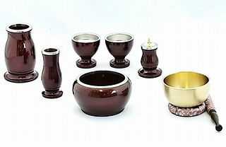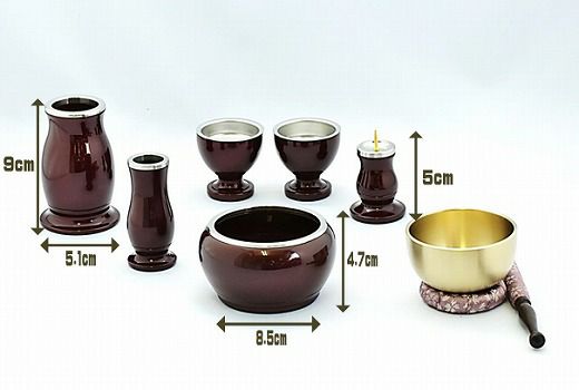 ○おリン一式 ○六具足:香炉(線香立)・花立・火立(ローソク立)・線差・仏飯器(ごはん)・茶湯器(お茶など) 香炉灰付き