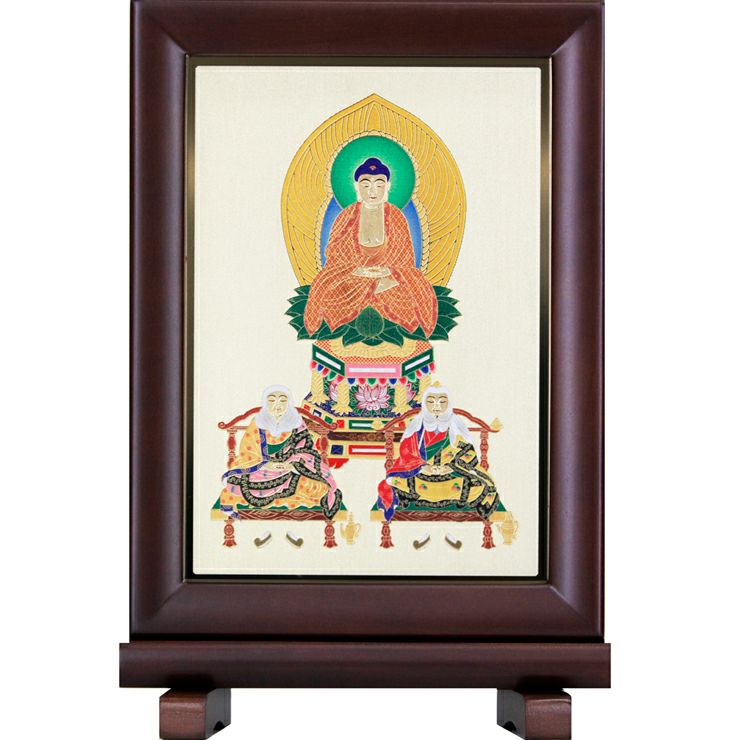 コンパクトなお仏壇やモダンなお仏壇に合うスタンドタイプのご本尊です。ご本尊と脇侍(脇仏)・三尊仏が一緒になっています。
