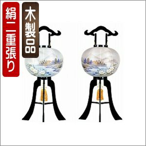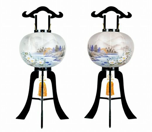 1対・2個で1組になっています。提灯の絵の図柄が、左右対称に描かれていますので1対に並べた時に大変豪華できれいです。最近は、ご家庭のスペースの問題もあり数を沢山飾るより、上質で良いものを数少なく置かれる傾向が強くなっていますが、この対柄の置き提灯は、高級感があり、豪華で見てきれいなので、特に人気があります。 素材:天然木 仕様:絹二重絵 絵柄:芙蓉に山水