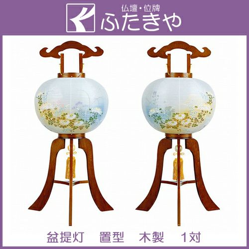 1対・2個で1組になっています。提灯の絵の図柄が、左右対称に描かれていますので1対に並べた時に大変豪華できれいです。最近は、ご家庭のスペースの問題もあり数を沢山飾るより、上質で良いものを数少なく置かれる傾向が強くなっていますが、この対柄の置き提灯は、高級感があり、豪華で見てきれいなので、特に人気があります。 素材:天然木 仕様:絹二重絵 絵柄:乱菊に七草