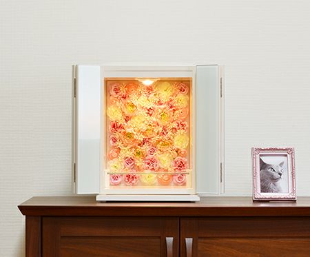 真っ白な外観と一面花をあしらった可愛らしいプレミアムモデルのペット仏壇です。